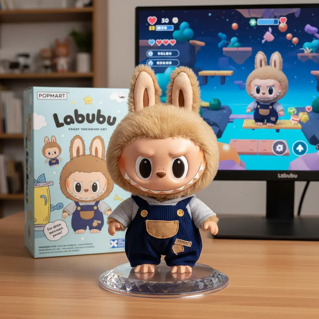 将这个动画角色转换为一个有趣的手办。在手办后面放置一个Popmart包装盒,盒子上印有角色图像和"Labubu"的名字。在盒子旁边,放置一个电脑屏幕,显示游戏场景,包括游戏界面和角色。在盒子前面,放置一个圆形塑料底座供手办站立。底座应该由PVC制成,具有水晶般清澈的半透明质感。将整个场景设置在室内。