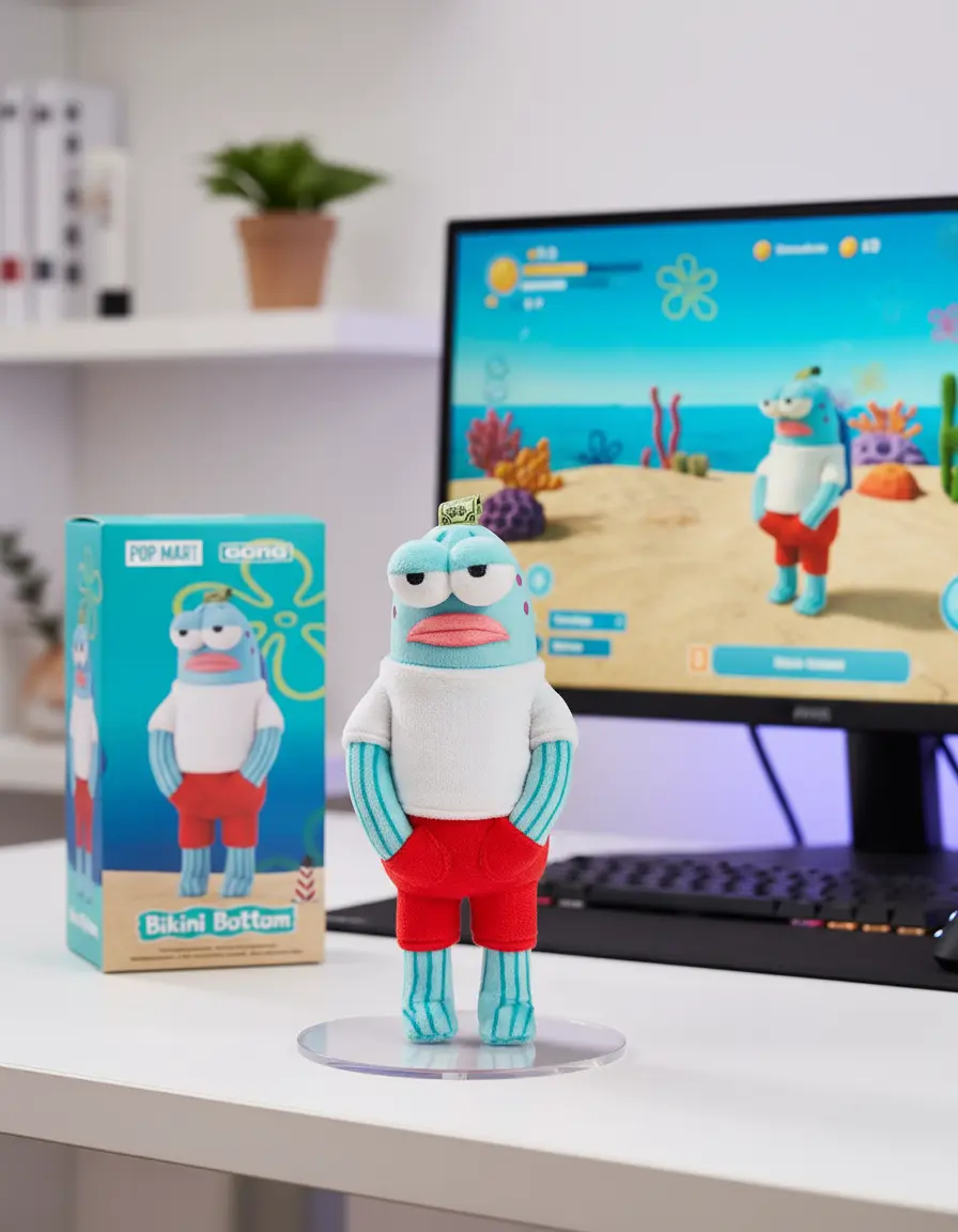 Please transform the character from this animation into a human figure. Place a Popmart packaging box with the character image and the name "Bikini Bottom" printed on it behind the figure. Next to the packaging box, place a computer screen displaying the game scene, including the Bikini Bottom UI and the character figure. In front of the game box, place a round plastic base for the character figure to stand on. The base should be made of PVC with a crystal-clear, translucent texture. The entire scene should be set indoors.