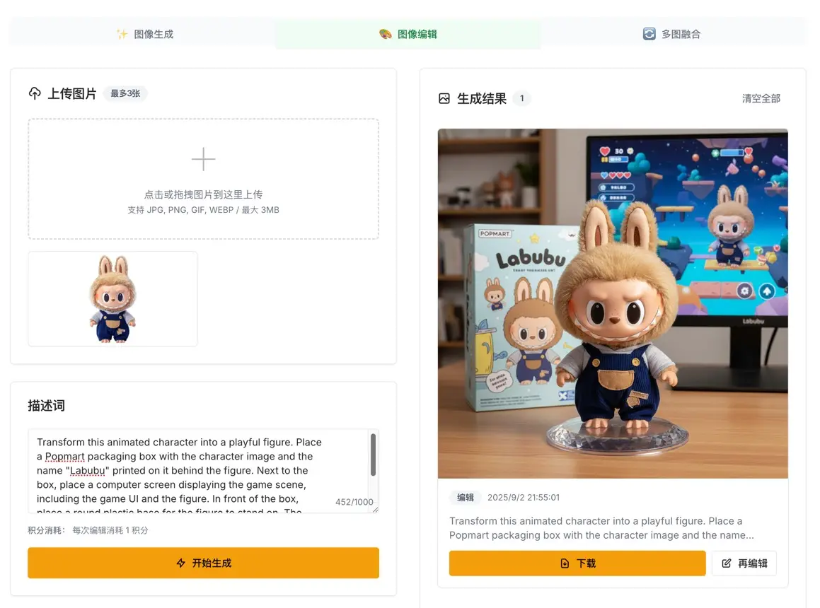 Want to quickly create professional Labubu figure display images? With Nano Banana's AI image editing platform, you only need a Labubu image with a relatively clean background and one carefully crafted prompt to generate stunning figure effects in one step. Whether you're a collectible toy enthusiast, designer, or content creator, this simple method will help you quickly produce professional-grade figure display images.