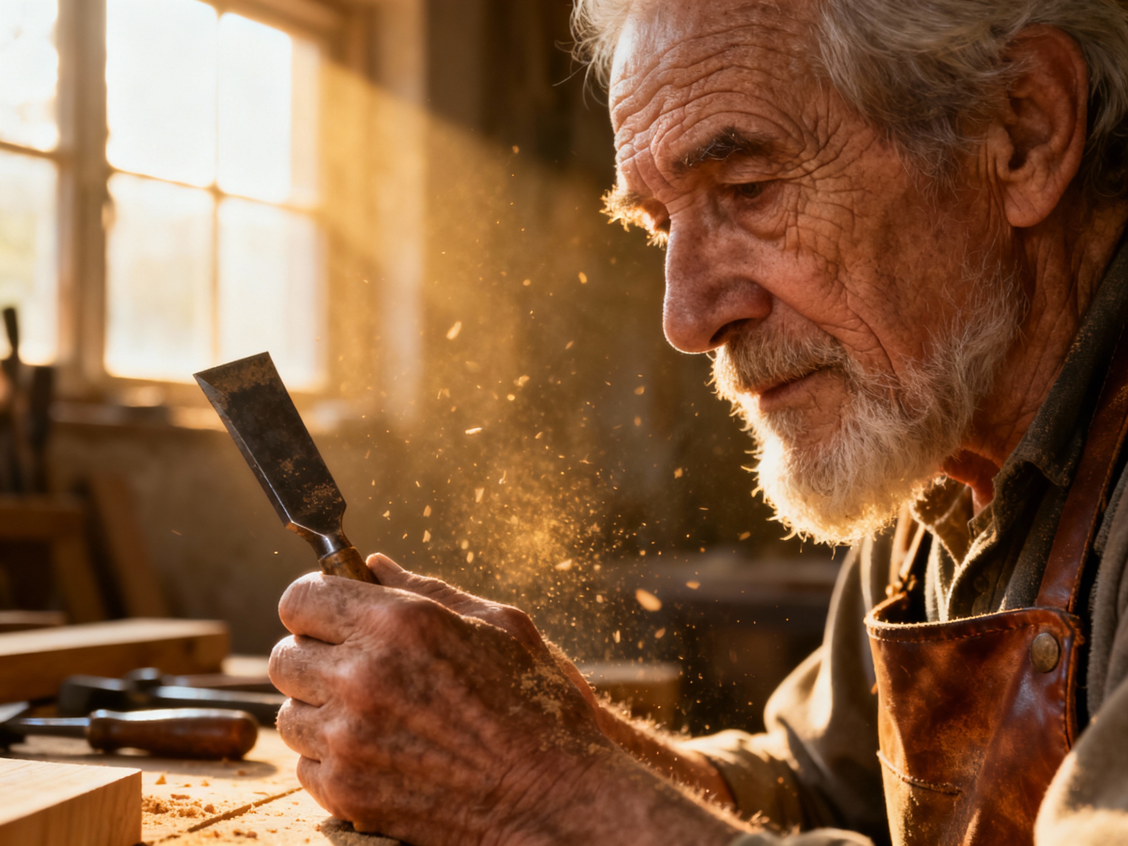 Prompt: Cinematic close-up portrait of an elderly artisan in a dusty sunlit workshop, deep facial wrinkles filled with stories, flying sawdust particles in the air, soft morning volumetric lighting, 135mm lens, f/1.8, hyper-realistic skin texture, 8k resolution. Focus Points: Observe the depth of wrinkles, the fineness of vellus hair, and the light-transmitting effect of dust in the air.
