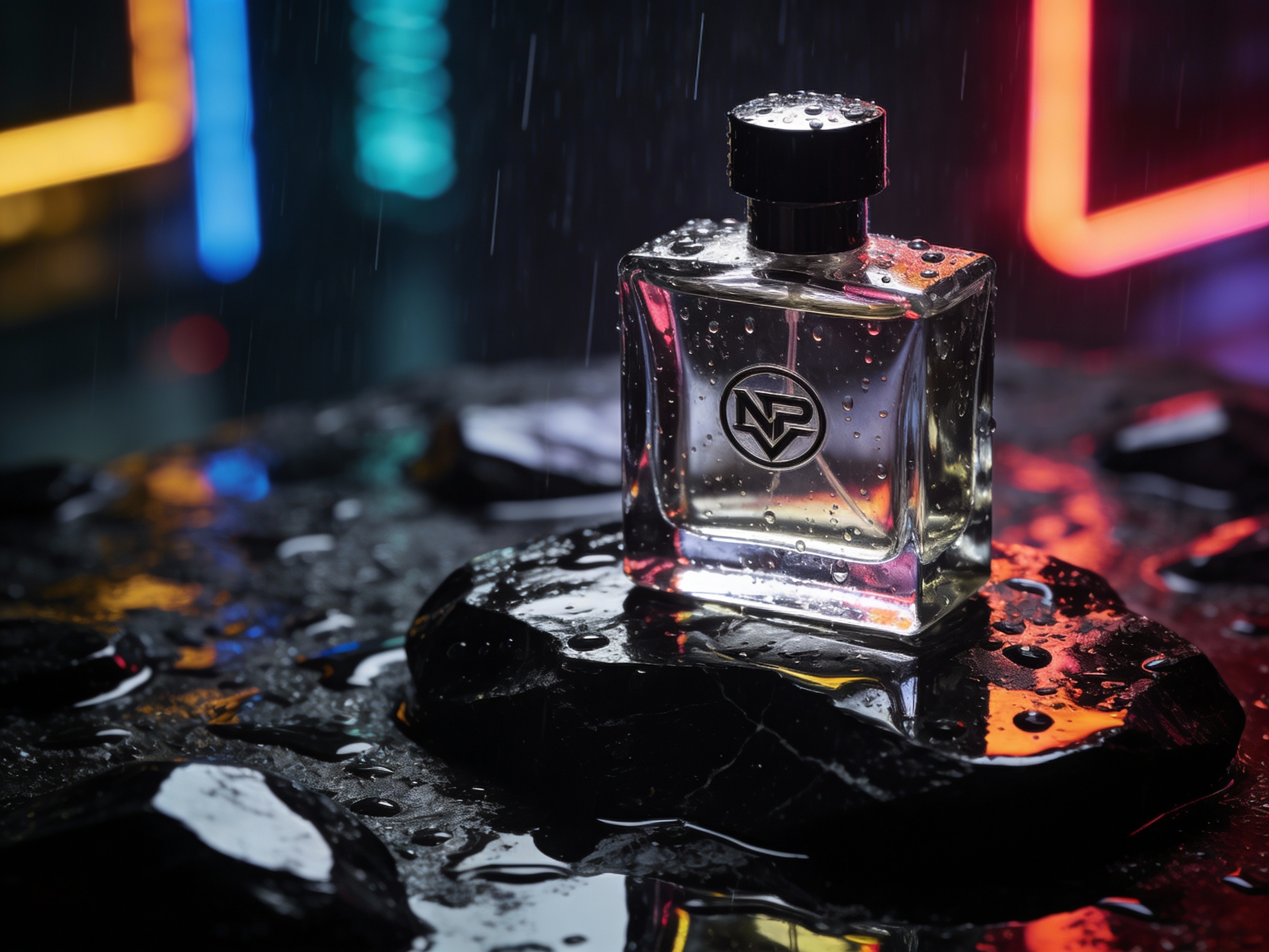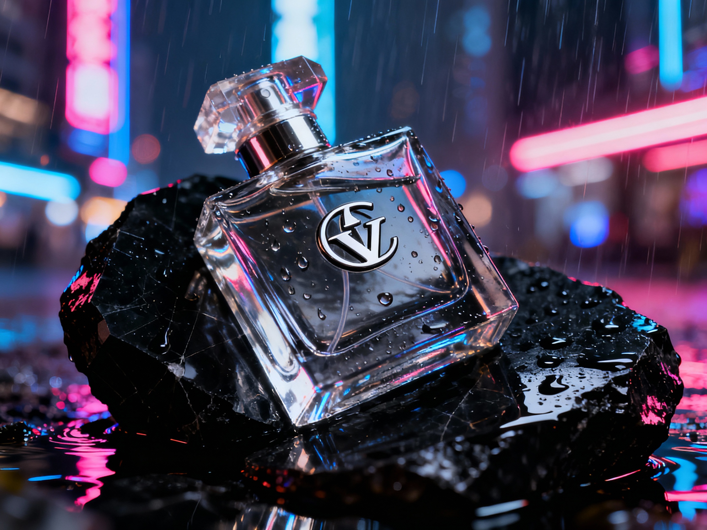 Prompt: A sleek futuristic transparent glass perfume bottle placed on a wet black obsidian stone, multiple reflections of neon city lights, raindrops on the surface of the bottle, luxury product photography, dramatic top lighting, sharp focus on the logo. Focus Points: 4.5 handles the refraction logic of glass more perfectly, as well as the surface tension effects of raindrops in contact with the bottle.